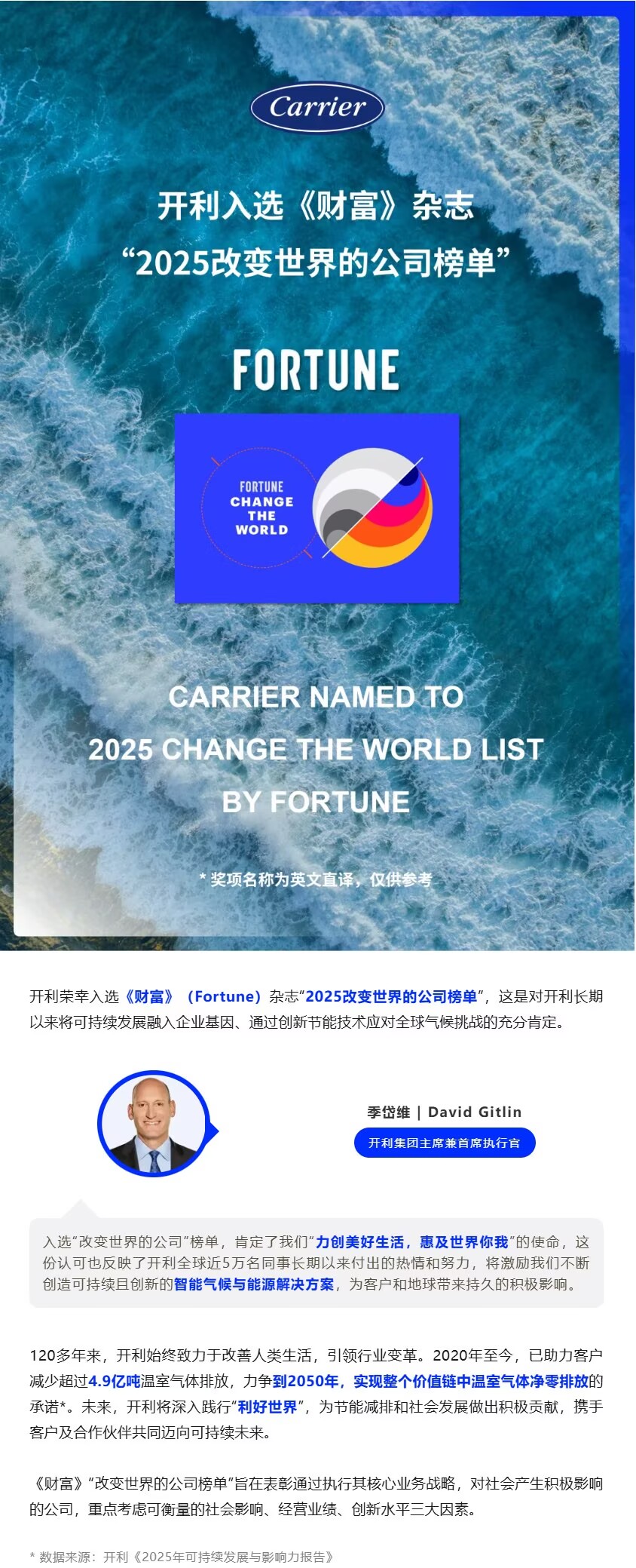利好世界 | 开利入选《财富》“2025改变世界的公司榜单”